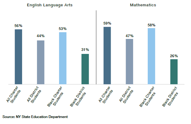 As shown in Figure 2, however, a bright spot on the achievement landscape in New York has been the performance of charter schools. On the most recent administration of the state’s annual exams in grades 3 through 8 in English Language Arts, students in charter schools outperform those in district-run schools by about 12 percentage points.