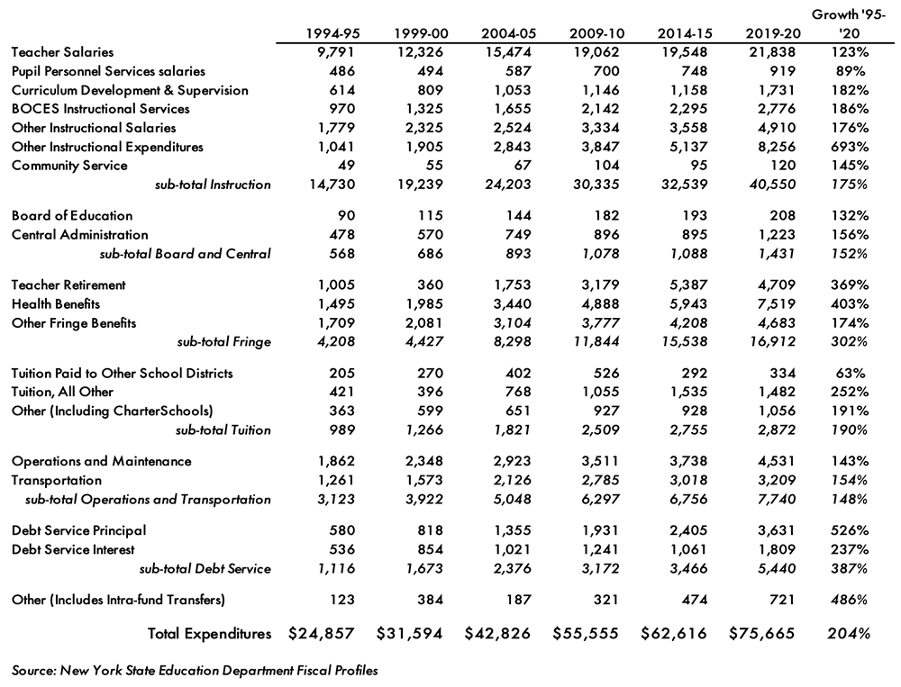 Based on the state Education Department’s own detailed database, which measures spending by somewhat different standards than the Census Bureau, a categorical breakdown of school finance trends over the past 20 years is presented in Table 1. Key trends emerging from state data for 1994–95 to 2019–20: