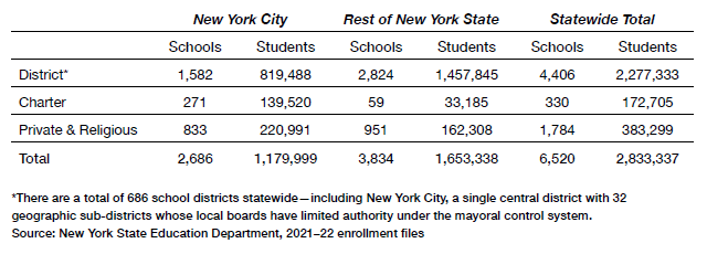 New York’s education sector is large and diverse. In the most recent year, 2021-22, over 2.8 million students attended one of 6,520 district, charter, and private religious schools in the state.