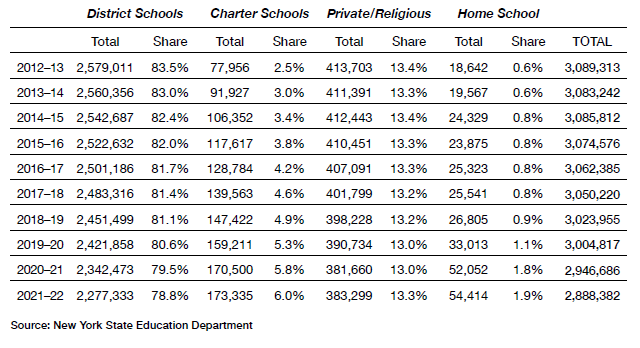 New York K–12 School Enrollment by Sector (School Years 2012–13 to 2021–22)