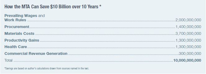 Result: With labor costs constituting approximately 40% of a large project’s cost,[11] even 15% savings on prevailing wages and work-rule productivity (shared equally between the MTA and construction unions) could save $2 billion over 10 years.[12]