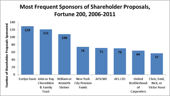 Four of these investors—Evelyn Davis, John Chevedden, and members of the Steiner and Rossi families—are individual investors who repeatedly file similar proposals across several companies in an effort to influence corporate behavior. Commonly called “corporate gadflies,”[14] these four investors, as I documented in earlier research,[15] have historically focused their proposals on procedural rules designed to increase shareholder voting power; all told, they have sponsored over two-thirds of all shareholder proposals introduced by individual investors.