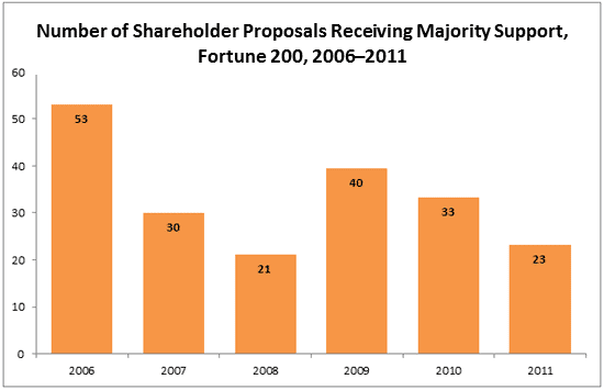 Through the 2011 proxy season, I authored a series of findings,[11] culminating in a full report in September 2011[12] that made the following observations: