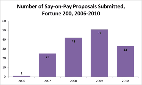 Background. Although now the law of the land, shareholder advisory votes on executive compensation were essentially unknown in American corporate governance prior to 2006, when, drawing on practice in the United Kingdom, the concept began to be introduced in shareholder proposals.[39] As shown in the graph below, one such proposal was introduced in 2006; but the number grew quickly: by 2009, 51 of the Fortune 200 companies faced a say-on-pay proposal on their annual meeting proxy ballots.