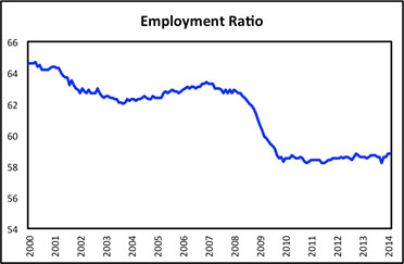 Second, the recent behavior of the unemployment rate itself ought to be enough to remind anyone who has temporarily forgotten the painful lessons of the 1970s of why setting specific unemployment targets for monetary policy is not only redundant but potentially quite harmful. The top panel of figure 2 confirms what we all know from the business headlines: over the period of slightly more than a year since the FOMC announced its 6 1/2 percent target, the US unemployment rate has fallen from 7.9 to 6.7 percent. If one were to take the Fed at its word, and these data at face value, one would have to conclude that the FOMC’s goals for unemployment have been almost entirely achieved, and that the time to start raising the federal funds rate might soon be at hand. Except, as the middle panel shows, the employment ratio – defined as the number of people who actually have jobs as a percentage of the total adult population – has hardly budged over the last year and, as a matter of fact, has yet to recover any of the ground lost since the 2007-09 recession.