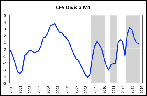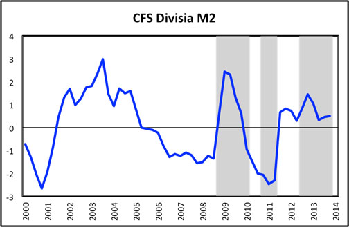 Recently, however, growth in the Divisia monetary aggregates has resumed and stabilized. This observation lends support to the consensus view, widely held both inside and outside the Fed, that inflation ought soon to begin returning to the two percent target. These data lend support, as well, to the view that the Fed can safely continue in scaling back on its enormous bond-buying programs.
