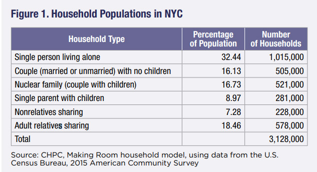 There are approximately 3.13 million households in New York City.[5] According to research by the nonprofit Citizens Housing and Planning Council (CHPC), the makeup of these households varies widely (Figure 1).[6]