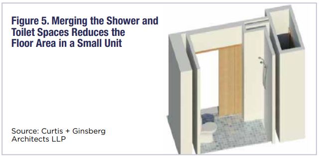 For most housing, a building must comply with the Federal Fair Housing Act and the New York City Building Code. With the 2014 update of the New York City Building Code, the two standards are largely in alignment. Accessibility codes affect minimum unit sizes because they require minimum door and hall sizes, as well as clearances at doors, appliances, and fixtures that allow mobility-impaired individuals to comfortably and safely navigate a space. Figure 4 shows a bathroom and kitchen layout for a 270-sf micro-unit that approaches the minimum possible size while complying with accessibility codes, which we see as a given condition. In addition to the standard bathrooms, our firm developed a slightly smaller bathroom that merges the shower and the toilet spaces (Figure 5). This unit shows that careful design would allow living units considerably below the city zoning’s current 680-sf average per unit, while meeting accessibility requirements.