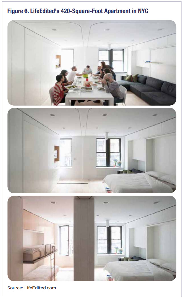 The design in Figure 4 is one of many that are possible. Another apartment design has been developed by Graham Hill, founder of LifeEdited. This unit is located in lower Manhattan in a typical apartment building (Figure 6). The space is designed to comfortably house two people, accommodate a dinner party of up to 12 people, and could even sleep two additional guests within 420 square feet.[31]