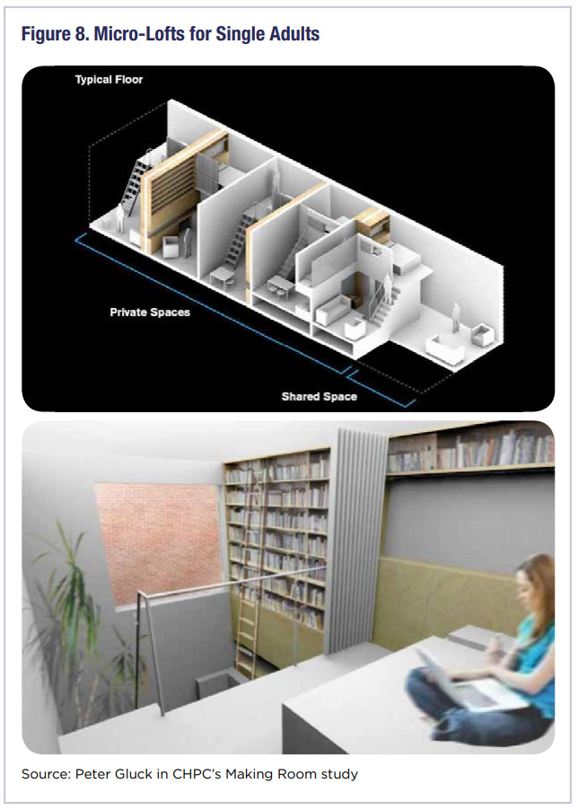 achieved in New York City by strategic changes to zoning, density, and building-code requirements to allow for smaller units, shared units, and other alternative housing arrangements.