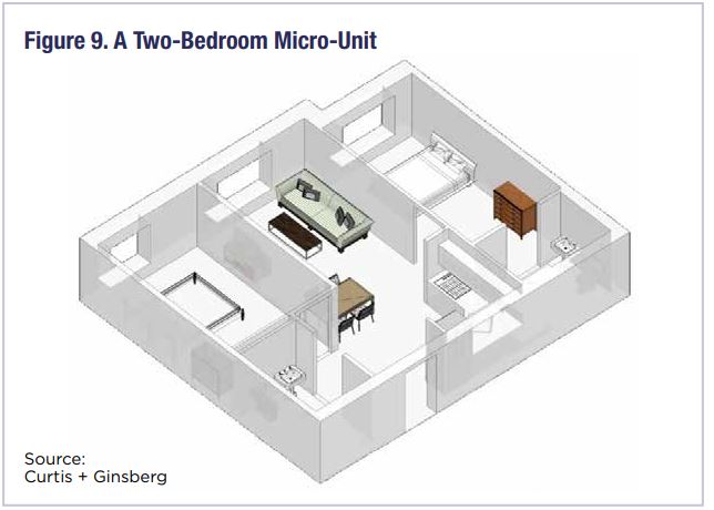 Shared units have become ubiquitous in New York City. Typically, younger singles or low-income singles will rent or purchase an apartment together, allowing them to find a relatively affordable housing option by taking an apartment designed for a family and sharing it. Shared units also enable a higher density because one unit of 600 sf is occupied by two individuals, resulting in an effective 300-sf unit per person. Our firm has produced studies for apartments that take advantage of this by developing a shared two-bedroom micro-unit that allows for some privacy between two unrelated tenants that share common spaces (Figure 9).