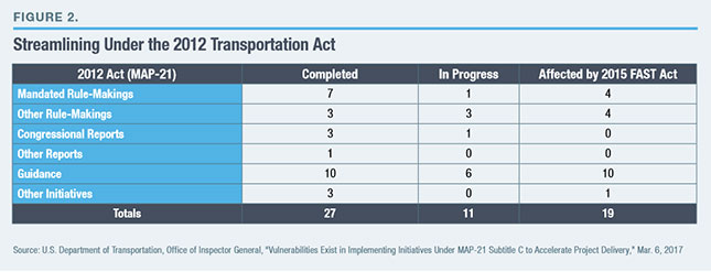 - U.S. Department of Transportation, “Vulnerabilities Exist in Implementing Initiatives Under MAP-21 Subtitle C to Accelerate Project Delivery,” Mar. 6, 2017.