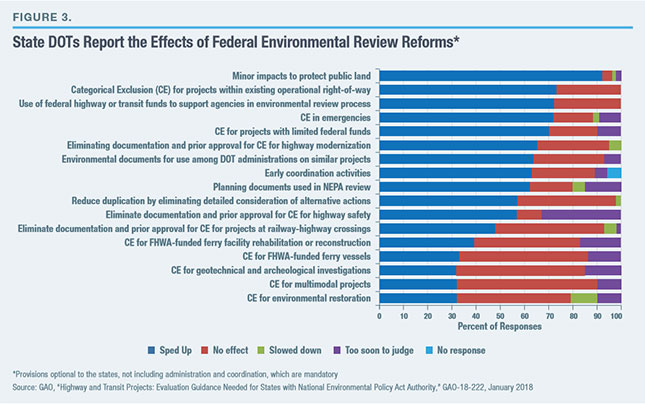 How effective have these various reforms been? A January 2018 Government Accountability Office (GAO) report[13] surveyed state DOTs regarding their use of a variety of some 31 provisions in federal legislation from 2005 to 2015 meant to speed up environmental evaluations of highway and transit projects. These included provisions that allow eligible projects to bypass some aspects of NEPA review, such as through the expansion of categorical exclusion determinations (Accelerated Review); provisions under which states can assume NEPA authority and undertake duties of environmental review and approval (NEPA Assignment); and provisions directed toward making the review processes themselves more effective, by establishing time frames or minimizing duplication (Administrative and Coordination Changes).
