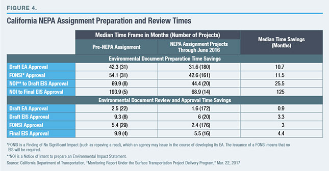 So far, six states have assumed authority for completing environmental reviews of highway and transit projects under the NEPA Assignment provisions, starting with California in 2007, followed by Texas in 2014, Ohio in 2015, Florida in 2016, and Utah and Alaska in 2017.[15] In its most recent report, the California Department of Transportation showed that it has been able to significantly reduce review times.[16] Before NEPA Assignment, approval of final EISs took a median of 9.9 months; that period has declined to 5.5 months. California also reports that the median time for draft EAs went from 5.4 months to 2.4 months (Figure 4). The time savings have been more substantial for document preparation. In the pre-NEPA Assignment baseline, the median time from filing a Notice of Intent to prepare an EIS to the approval of a final EIS was 194 months; this has declined to 69 months. Median times for preparation of other types of analysis also saw significant reductions of at least 10.7 months.