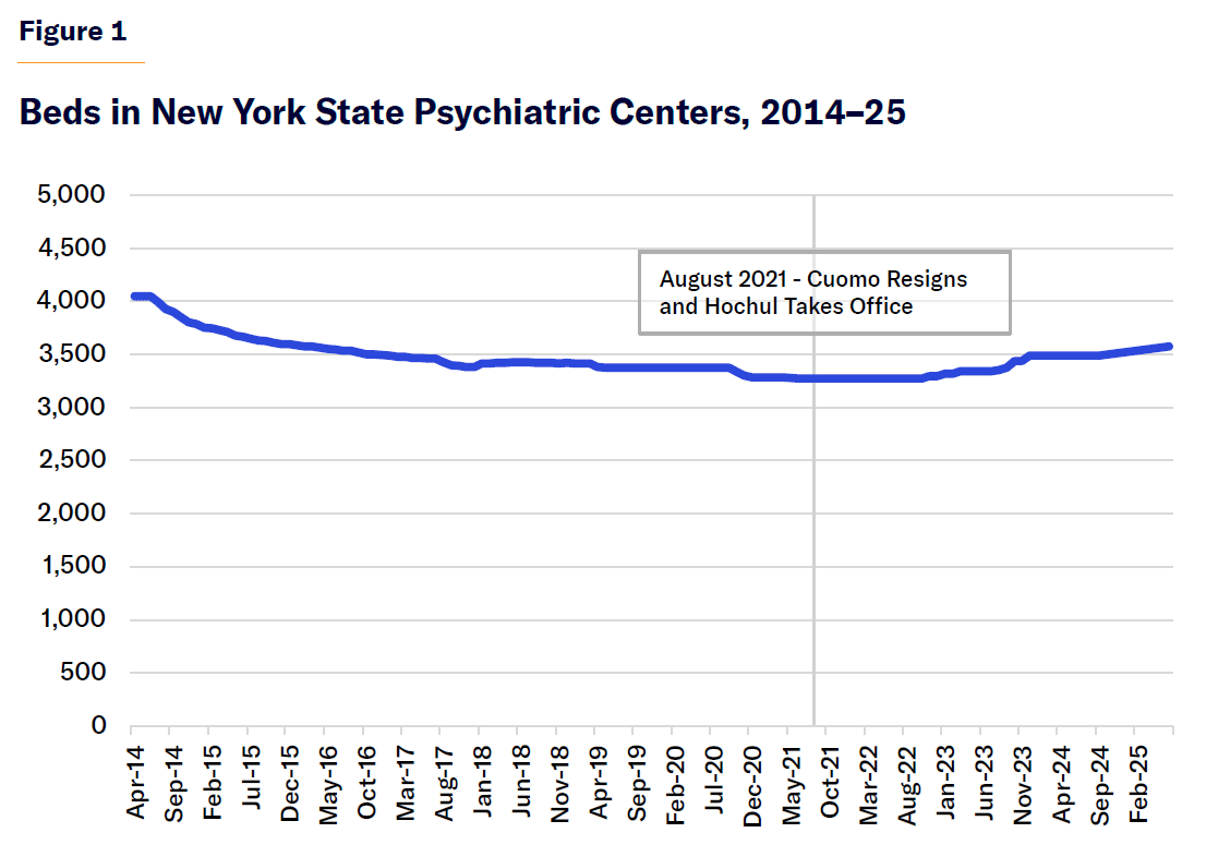 Cuomo originally pursued closing facilities outright. But after facing opposition, he reoriented to reducing beds, cutting more than 700 by the end of his term. Figure 1 shows the decline in beds in state psychiatric centers from 2014, when the Transformation Plan began, to the present.