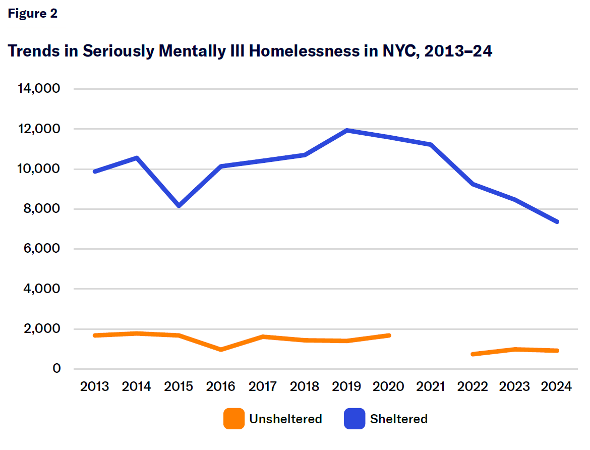 In NYC, for seriously mentally ill adults, the homeless services system is a far larger operation than jails and hospitals. There are more than 7,000 seriously mentally ill individuals in city shelters (Figure 2), compared with 1,600 in the jails and 4,100 in psychiatric hospital beds.[15] Apart from the state’s mental health policy, New York’s unique “right to shelter” law may play a role in these proportions. In other cities without a right to shelter, homeless services may not play such an outsize role in serving the seriously mentally ill. In 2024, 1,000 individuals discharged from state psychiatric centers were sent to an NYC shelter.[16] By some estimates, nearly half of all single adult shelter clients in the Department of Homeless Services system have a serious mental illness.[17] But, though large, the number of seriously mentally ill sheltered homeless New Yorkers has been decreasing in recent years.