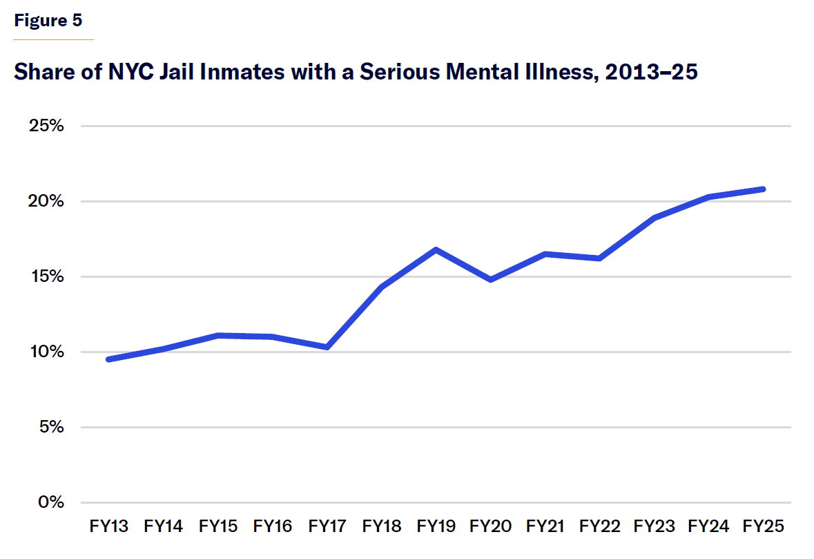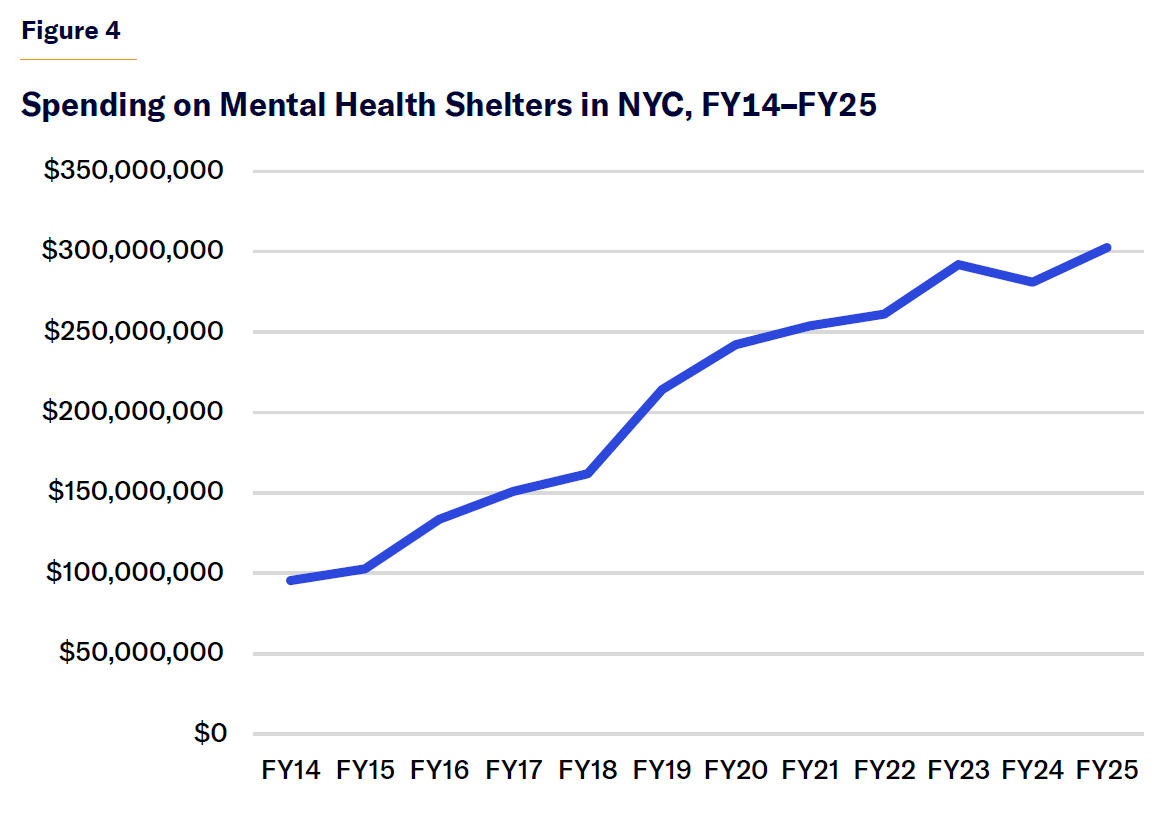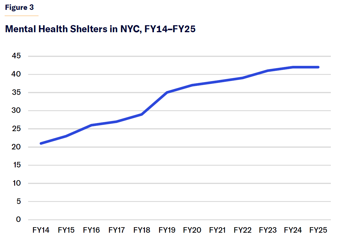 • The number of specialized mental health shelters in NYC rose from 21 to 42 between 2014 and 2025. Mental health shelters are home to a larger population of seriously mentally ill individuals than jails and psychiatric hospitals. Mental health shelters cost NYC $300 million annually. The rate of growth of mental health shelters and spending on them has slowed in recent years.
