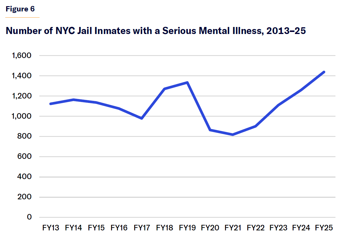 The raw number of seriously mentally ill inmates, as well as the rate of serious mental illness among the city’s jail population, has increased steadily since Covid (Figures 5 and 6). As of June 2025, the number stands at about 1,600.[25] That figure far exceeds the bed count of NYS’s largest psychiatric hospitals (Rockland State and Creedmoor each have about 340 adult beds).[26]