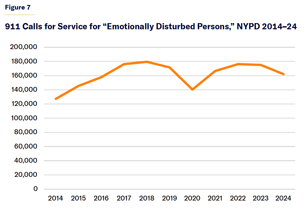 Untreated serious mental illness also burdens the police department, which responds to about 170,000 “emotionally disturbed person” (EDP) calls per year. This rose during the Transformation Plan and has remained elevated, though it has not been rising recently (Figure 7).