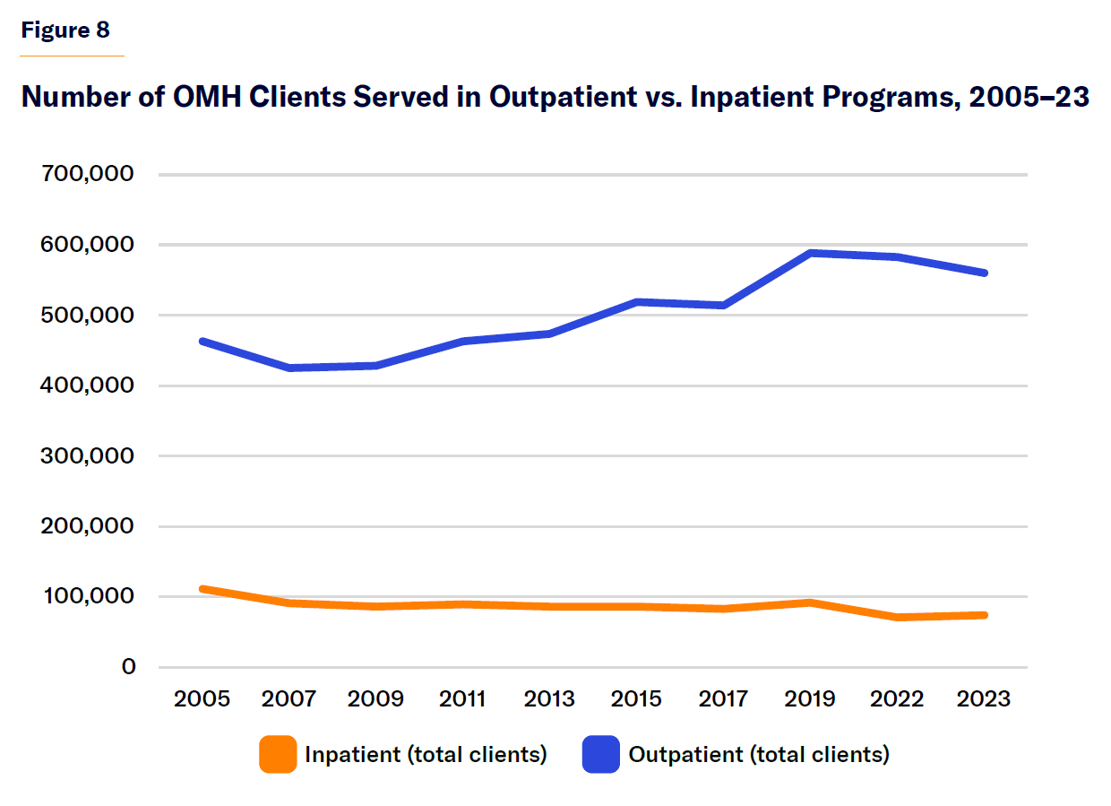 Source: “OMH Transformation Plan Status Reports” and “Inpatient Bed Capacity,” NYS OMH, 2025