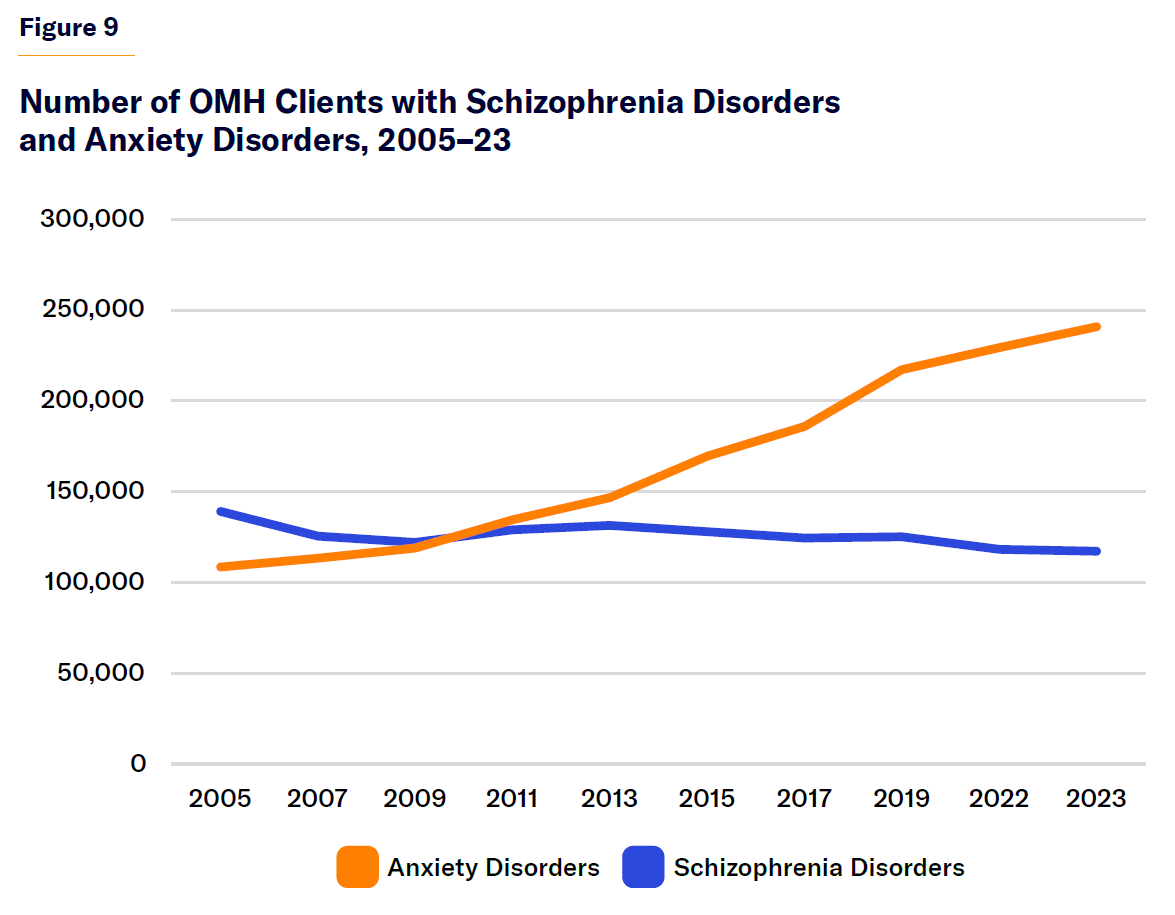 Second, cease relying on the increased number of people using mental health services as a metric of success. One point of continuity between the Cuomo- and Hochul-administered Transformation Plan is the use of the number of individuals as a sign of policy success.[68] Who is served by the system, and their level of need, is more important than how many people have received services. According to OMH data, the shift in services from inpatient to outpatient services (Figure 8) has coincided with a rise in the number of people with anxiety disorders served by the system and a decline in the number of people with psychotic disorders served (Figure 9).