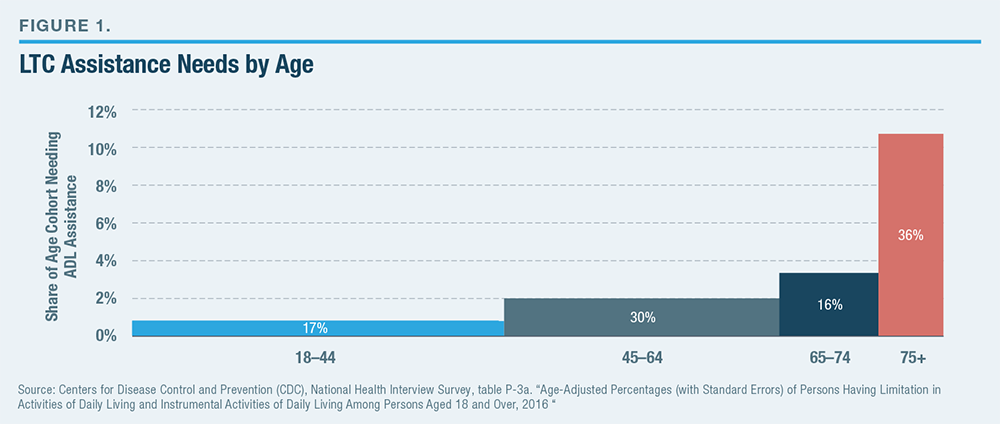 LTC needs increase with age (Figure 1).[3] Of those reaching age 65, 70% will develop severe long-term care needs at some point in their lives, and 48% will employ paid care. As Americans age, these disabilities become more severe, and they are less likely to have relatives able to fully assist them. A recent report noted that while 8% of retirees aged 65–74 had severe LTC needs, 40% of those over 85 did.[4] Indeed, 22% of Americans over 85 live in a nursing home.[5]