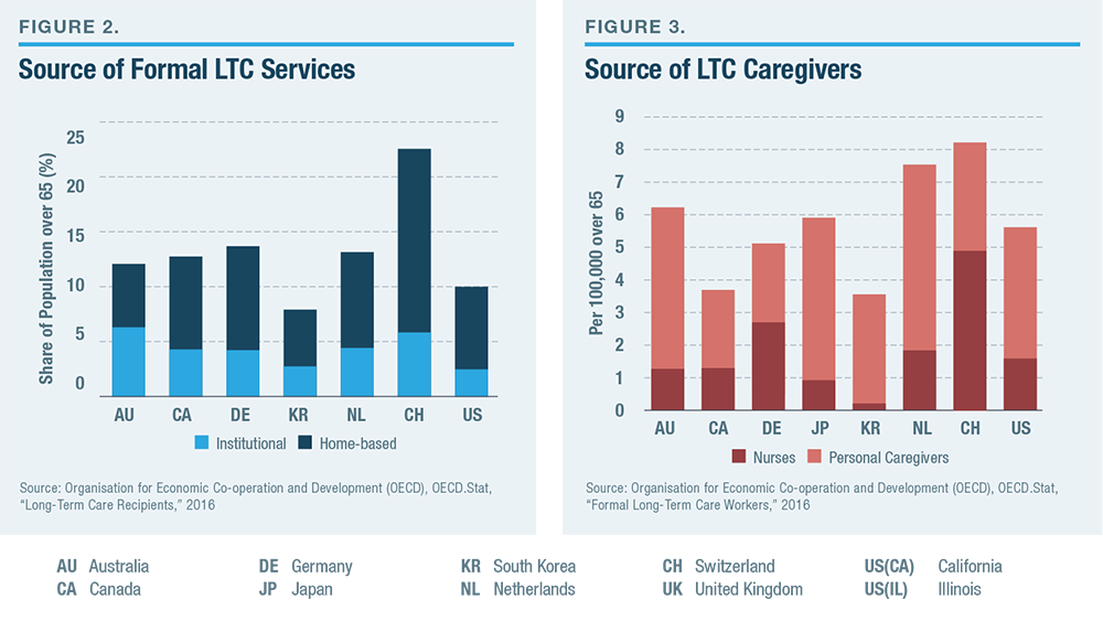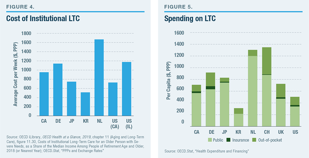The U.S. has a slightly smaller share of its elderly population receiving LTC services in nursing homes than other developed countries but a similar level of homebased services (Figure 2). The overall number of LTC nurses and personal workers per senior citizen is also in line within the range that is typical among developed countries (Figure 3). The cost of institutional LTC in the U.S. is similar to that in other developed countries (Figure 4). By contrast with medical care, where spending in the U.S. is much higher than in other developed countries, Americans spend significantly less on LTC (Figure 5). The high level of U.S. spending on medical services is distinguished by the fact that half of it is privately financed; private funds support less than a third of America’s LTC.[64]