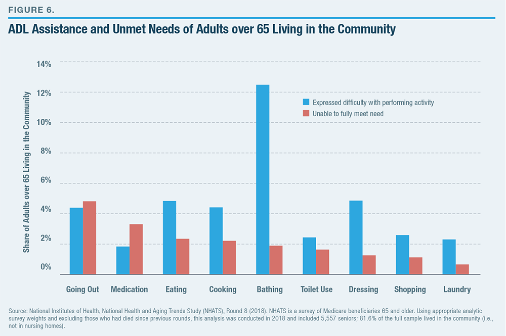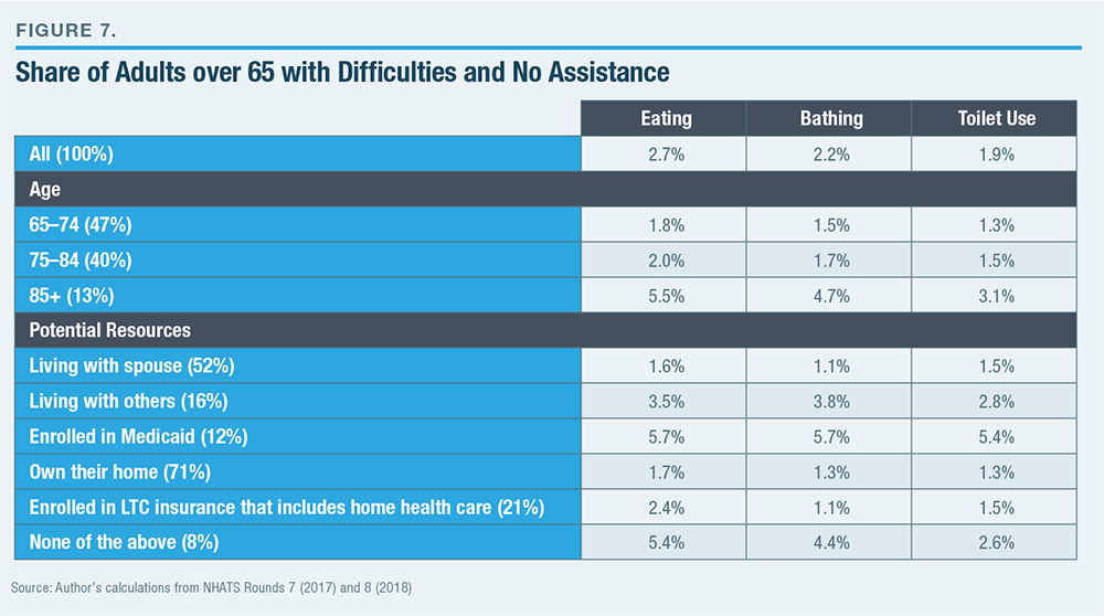 Relative magnitudes are instructive. Of those who had unmet needs for assistance using the toilet, 35% were Medicaid beneficiaries, 49% owned their homes, 41% lived with a spouse, while only 10% had none of those potential resources. This would suggest that the problem of unmet needs relates more to the shortcomings of existing forms of coverage and assistance than excessively narrow eligibility for them. While 3.1% of seniors needed assistance using the toilet, only 0.2% of seniors had unmet needs for this assistance and none of the potential resources.[65]