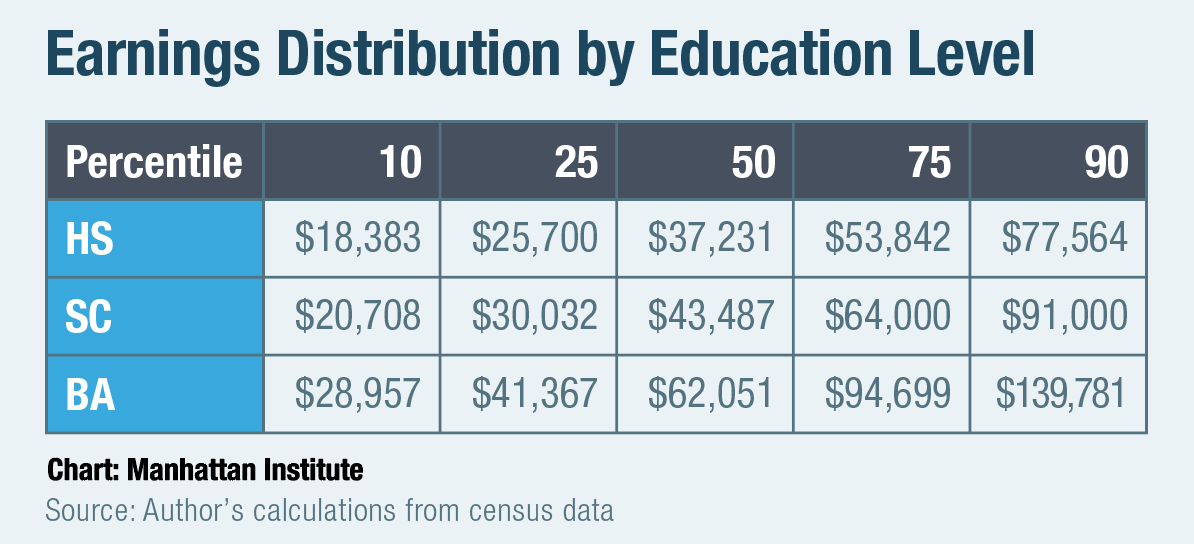 These experts portray a labor market with high-earning and low-earning pools, the former of which can be entered only by completing a college degree. This is doubly wrong. First, although the average college graduate has higher earnings, these averages mask enormous variation within each group that leaves the distributions overlapping substantially. Roughly speaking, the top half of the high school pool overlaps the bottom half of the college pool, with everyone in the top quarter of high school graduates outearning everyone in the bottom quarter of college graduates.