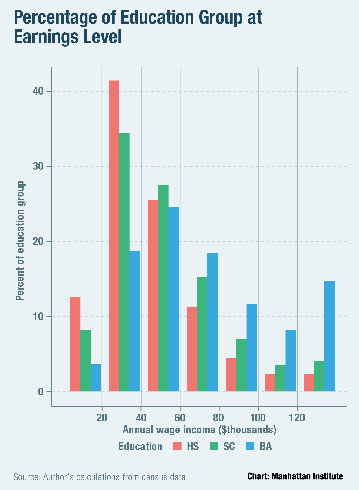Most important, for policymakers, this is how the picture looks before any substantial effort to construct noncollege pathways for the workforce. Today, regardless of aptitude or preparedness, a high school graduate enrolling in college can receive enormous subsidies to help fund a campus experience that can appear more amusement park than education. That same high school graduate, making the often wise choice to move instead toward a job, gets nothing. The asymmetry in investment is even more shocking, given that most young Americans still do not earn even a community-college degree. How much better would be the lives of these students—the majority of American youth—if we invested in them, too? Unfortunately, all they receive now are incessant pleas, along with financial incentives, to go to college. But as this paper underscores, “opportunity” and “college” are far from synonymous.