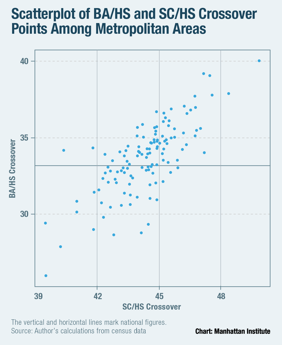 To control for geography, we consider the earnings distributions in the 122 census-defined Metropolitan Statistical Areas (MSAs) with at least 1,000 survey records for each of HS, SC, and BA. As shown in Figure 3, BA/HS crossover points for MSAs vary from 26.0 to 40.0, with half clustering in the interquartile range between 32.6 and 35.0; the SC/HS crossovers range from 39.5 to 49.8, with half between 43.3 and 45.2. BA/HS and SC/HS crossover points are highly correlated among metropolitan areas.