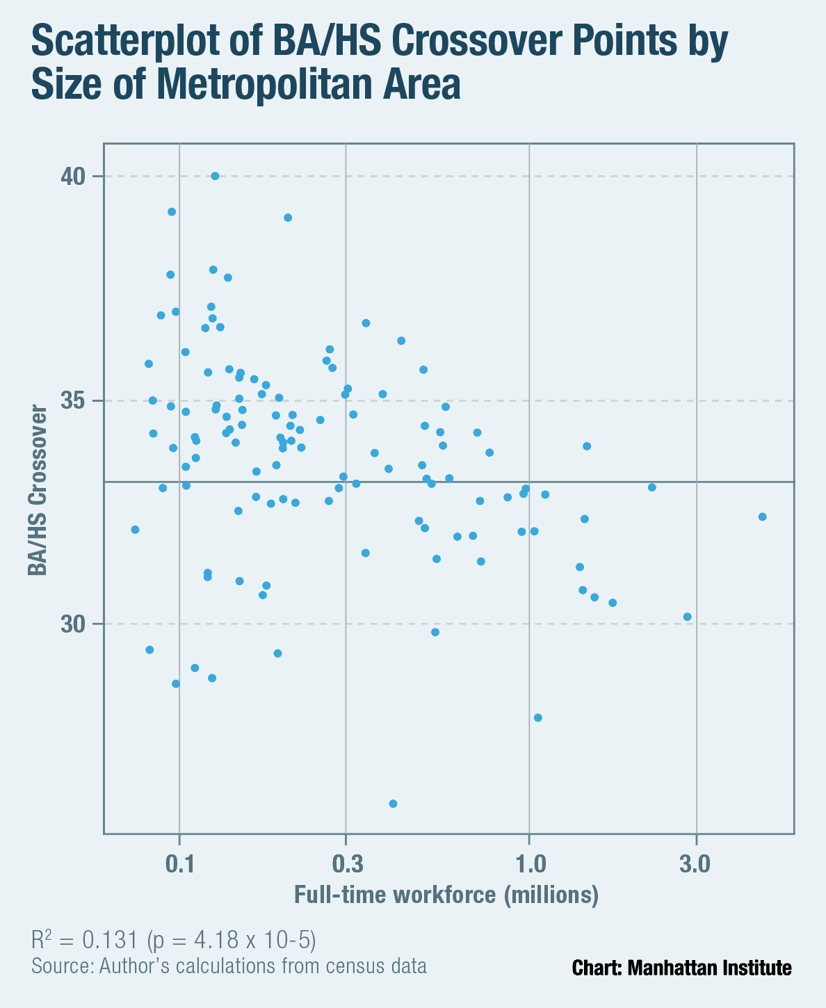 As shown in Figures 4 and 5, overlap decreases moderately as the overall size of the MSA workforce increases, driven mostly by higher incomes for workers with BAs in larger MSAs, not lower incomes for those without BAs. Every 10% increase in the size of an MSA workforce corresponds with an average reduction of 0.094 in BA/HS overlap; the correlation between overlap and workforce size is -0.39.
