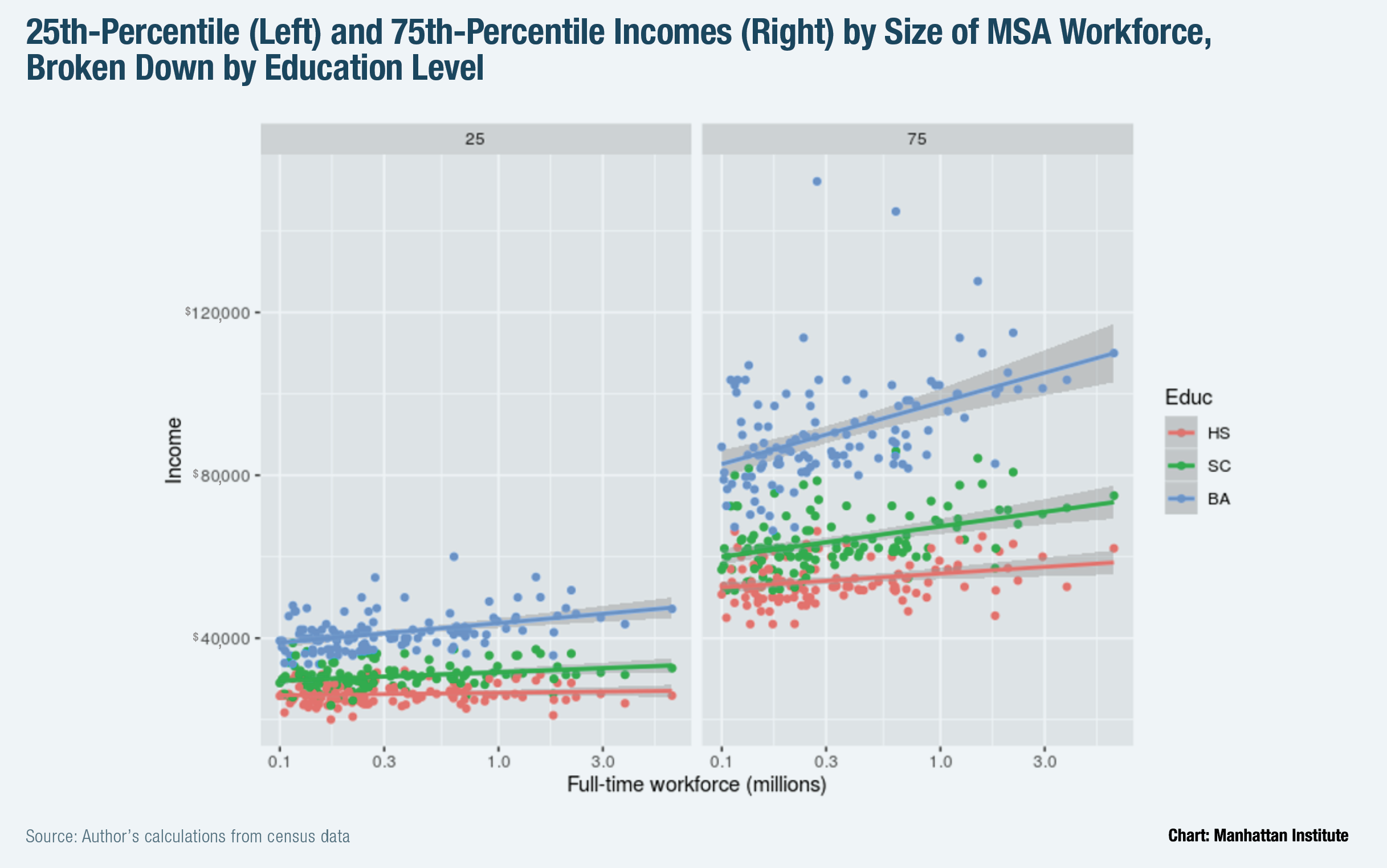 This finding aligns with recent work by David Autor and colleagues, showing that while workers of all education levels once received higher wages in denser cities, this premium has vanished for workers without college degrees.[10] Similarly, Peter Ganong of the University of Chicago and Daniel Shoag of Harvard University,[11] as well as Federal Reserve economists Keith Wardrip, Kyle Fee, and Lisa Nelson,[12] have shown that incomes for more educated workers keep pace with the higher cost of living in larger cities, while those for less educated workers do not.