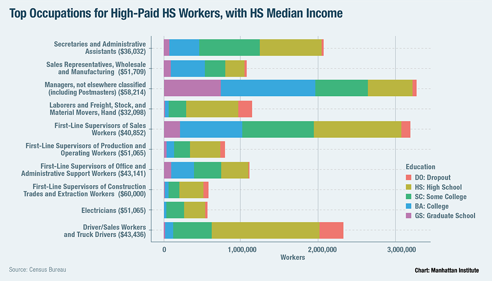 - High school–only workers who reach the top of their earnings distribution often do so in occupations where entry-level positions offer a pathway to advancement. Many college graduates, by contrast, are employed in positions that do not require a degree.