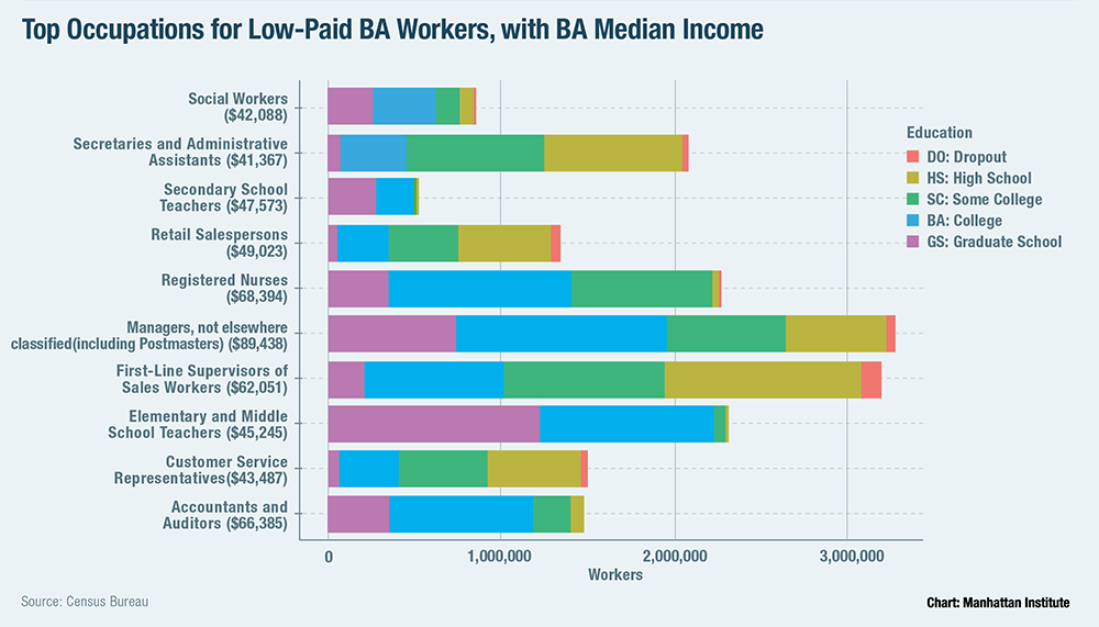 The picture for BA workers in the bottom third of their distribution is somewhat different. There are two distinct categories of occupations in this group: those that require a college degree but often pay low salaries; and those that require no college degree and have more HS than BA workers in them. The first group includes elementary school teachers, social workers, accountants and auditors, and designers. The second group includes secretaries, customer service representatives, retail salespeople, and supervisors, as well as the catchall “manager” category.