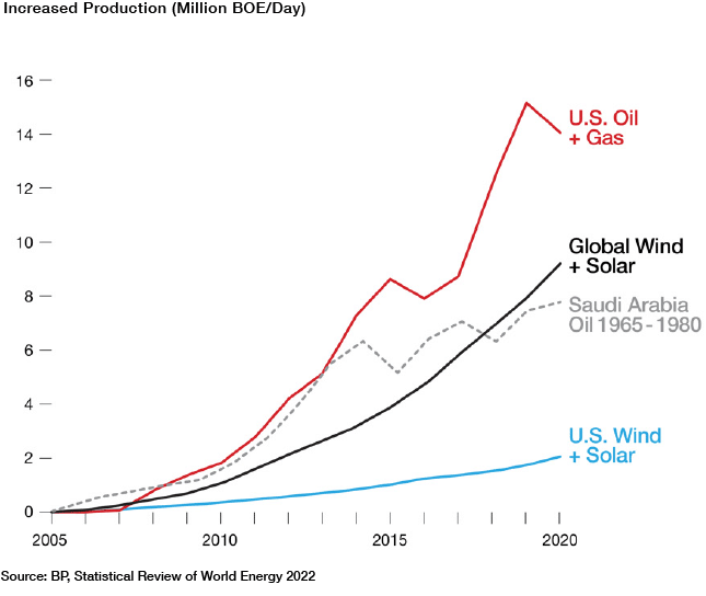 The scale and velocity of the revolution that unlocked the vast amount of oil and natural gas in America’s shale fields was history’s fastest and greatest addition to global energy supply. The only comparable expansion happened from 1965 to 1980, with the opening of Saudi Arabia’s giant Ghawar oil field, which led to the creation of OPEC and reshaped geopolitics. The pre-pandemic shale expansion added 800% more energy to the U.S. than did the (subsidized) growth of solar and wind combined, and shale energy expanded by nearly double the growth of global solar and wind power production.[123]