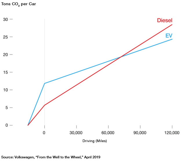Miles Driven Before an EV Emits Less CO2 than a Diesel Car