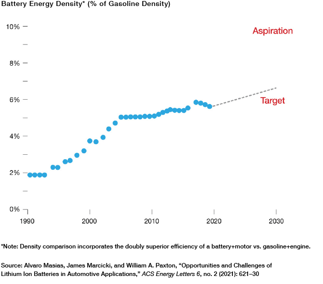Lithium battery performance—energy stored per pound—has tripled since its introduction, though progress has slowed in the past decade.[128] The target performance for batteries—and even the (still pre-commercial) aspiration for super-density lithium-metal chemistry—still doesn’t come close to matching gasoline. An EV has a massive half-ton battery to match the range of about a dozen gallons of gasoline weighing 85 pounds. Advocates claim that “energy tech” can conquer that gap, often analogizing with the progress of digital tech—computing’s exponential growth—but such a comparison isn’t just flawed; it’s impossible in the physics of energy. If lithium chemistry could emulate digital progress since 1990, an EV today would have a battery the size of a single flashlight C cell, not one weighing 1,000 pounds.