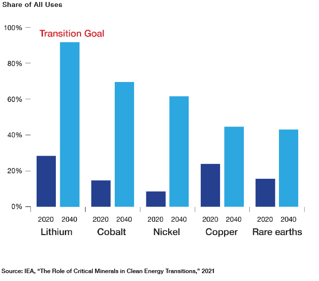 All energy systems require using minerals and materials to build the necessary machines and physical infrastructures. As a seminal IEA analysis observed, an energy transition is a “shift from a fuel-intensive to a material-intensive energy system.”[46] That agency’s estimates for a path that is far short of completely eliminating hydrocarbons show the need to increase the supply of minerals such as lithium, graphite, nickel, and rare earths by 4,200%, 2,500%, 1,900%, and 700%, respectively, by 2040.