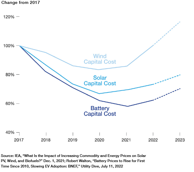 Solar power economics have been similarly transformed. There, too, thanks to improved manufacturing, commodity inputs now constitute about 70% of the overall price of a solar module. But escalated mineral commodity prices have also reversed the long-run declines in solar module costs; prices are up about 50% over the past few years. Materials make up 20% of the overall cost of wind turbines. Current forecasts see wind-turbine prices rising by about 25% over the next year because of higher material costs.