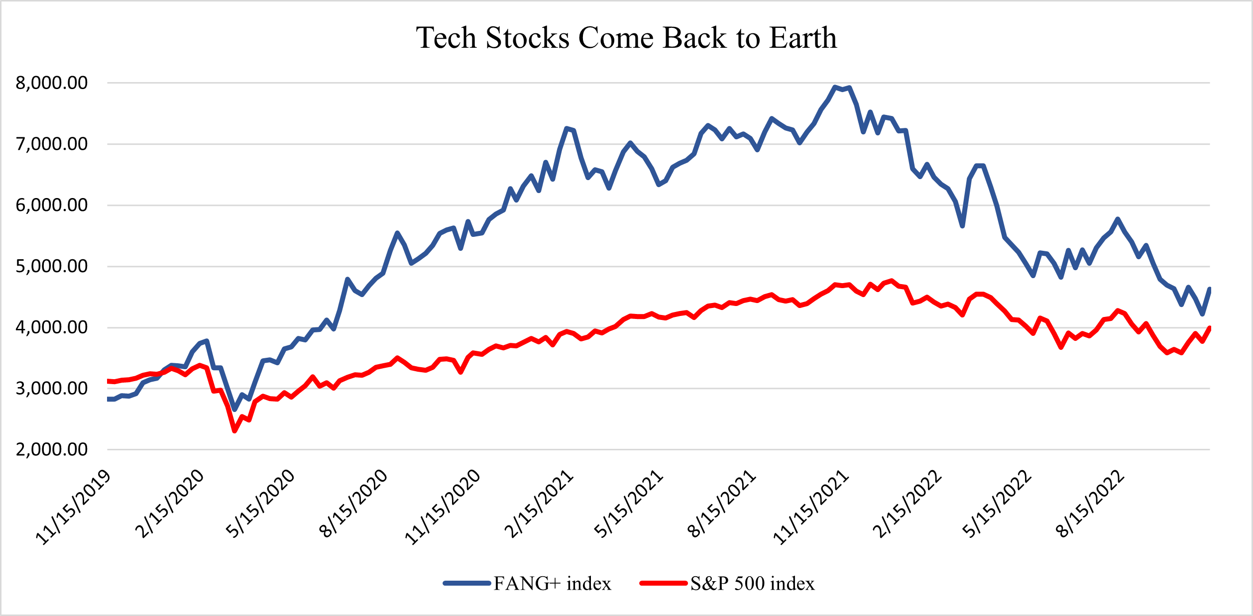 Amazon joined other big tech firms this week when it announced significant layoffs of its staff. Buoyed by low interest rates big technology firms have dominated the stock market and grown in size. But now the market is turning on them. The figure below shows the FANG+ index an index of the biggest publicly traded tech firms, over the last 3 years compared to the S&P 500. Much of the run up in stocks came from tech, and now it accounts for a big share of the fall in prices. The question is will a contraction of the tech sector spill into the rest of the economy when it comes to jobs too?