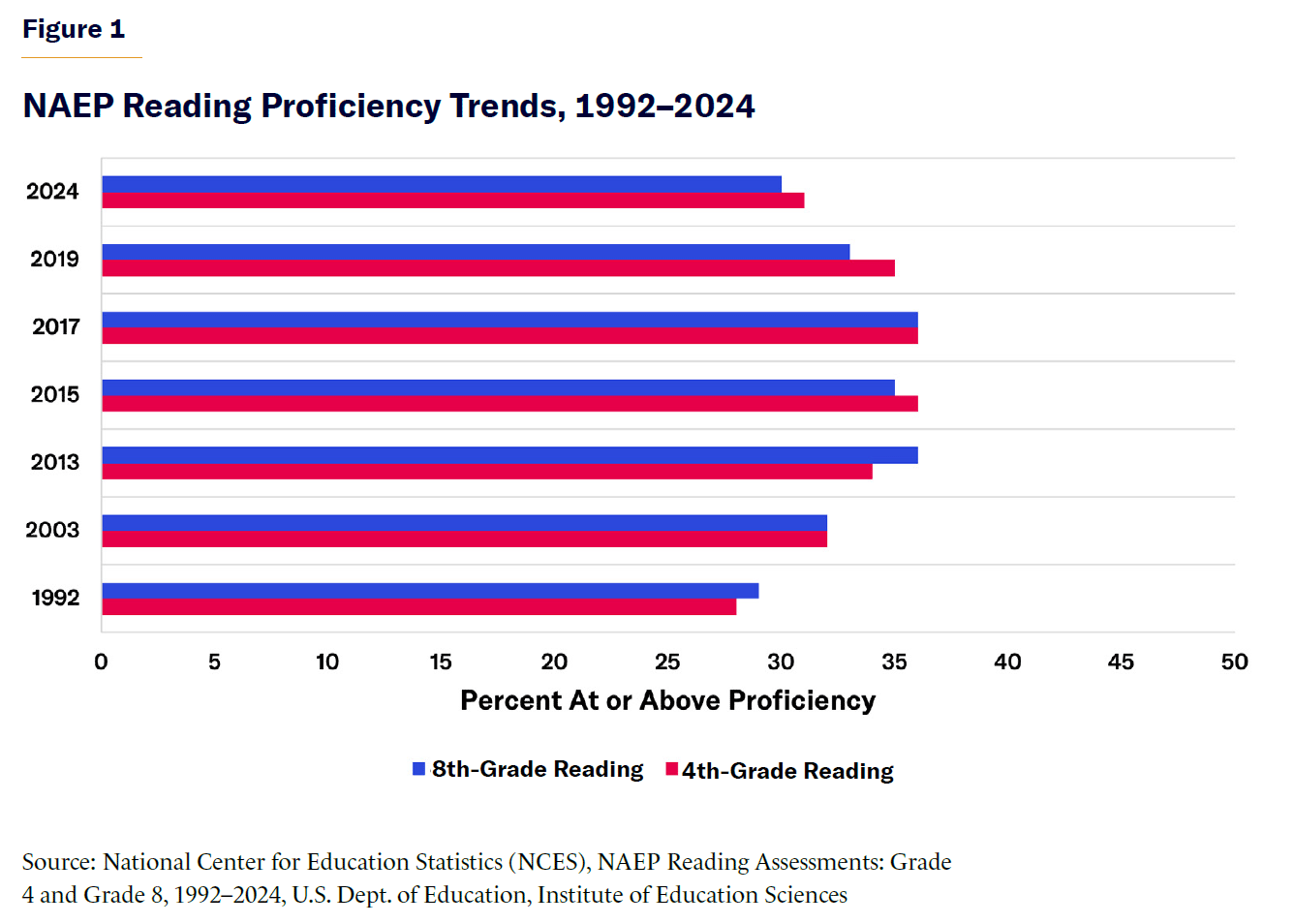 The 2024 NAEP results released in January confirm a long-term stagnation in literacy, with reading proficiency remaining nearly unchanged since the early 1990s (Figure 1). Reading proficiency improved slightly from 1992 to 2013, peaking in 2013 at 35% (fourth grade) and 36% (eighth grade). However, by 2024, scores had regressed to early 2000s levels, with just 31% of fourth-graders and 30% of eighth-graders proficient in reading.