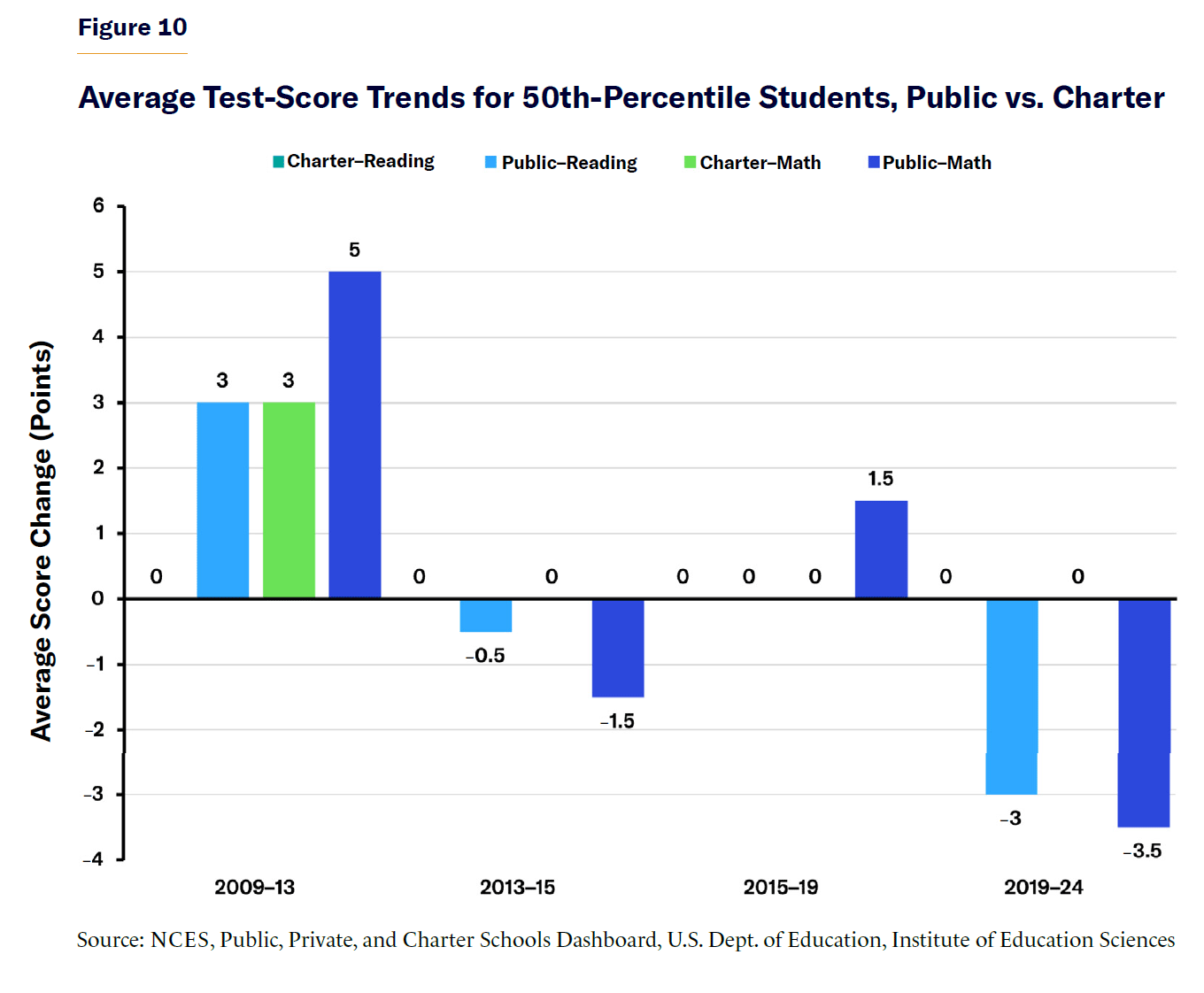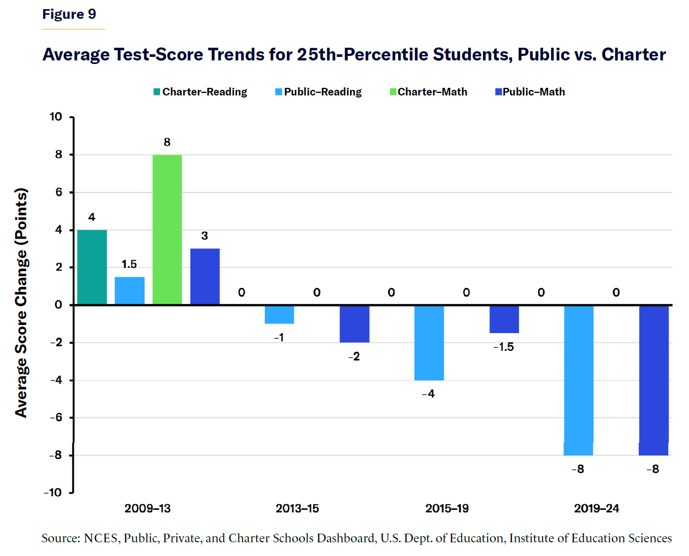 - Between 2013 and 2024, the lowest-performing public school students (25th percentile) lost an average of 12 points, compared with an 8-point decline among charter school students. Among average-performing students (50th percentile), public schools declined by 5 points, while charter schools remained stable. Charter schools provided more stability across all student performance levels.