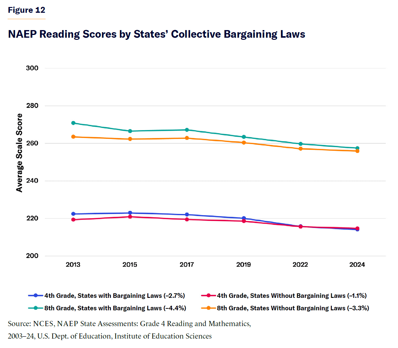 The role of collective bargaining in education policy has been widely debated. Supporters say that these laws protect teachers’ job security and ensure fair pay, while critics argue that they create barriers to instructional reform and impede efforts to meet student needs. My analysis of NAEP data during 2013–24 shows that states with collective bargaining laws experienced larger declines in reading and math compared with states without them since 2013. Specifically, 88% of bargaining-law states saw declines in reading and 79% in math, versus 68% and 56% in states without such laws.