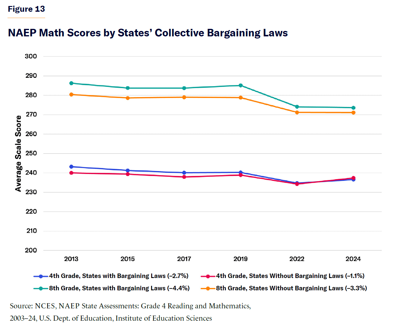 Specifically, in reading, states with collective bargaining laws saw a 3.7% decline in fourth-grade scores and a 4.9% decline in eighth-grade scores, compared with 2.1% and 2.9% declines in non-collective bargaining states. In math, collective bargaining states saw a 2.7% decline in fourth-grade scores and a 4.4% decline in eighth-grade scores, compared with 1.1% and 3.3% declines in non-collective bargaining states (Figures 12 and 13). Although states without collective bargaining laws tended to have lower overall scores at the start of the period in 2013, the rate of decline was significantly larger for states with collective bargaining. This suggests that while these policies provide job security, they may also limit the ability of schools to make necessary instructional changes to sustain student achievement. Of course, correlation does not imply causation. States with collective bargaining laws may have other policy differences contributing to these declines. More research is needed to determine the direct impact of collective bargaining restrictions. Still, the trend suggests that labor policies should be reassessed to ensure that they support—rather than hinder—efforts to improve student academic outcomes.