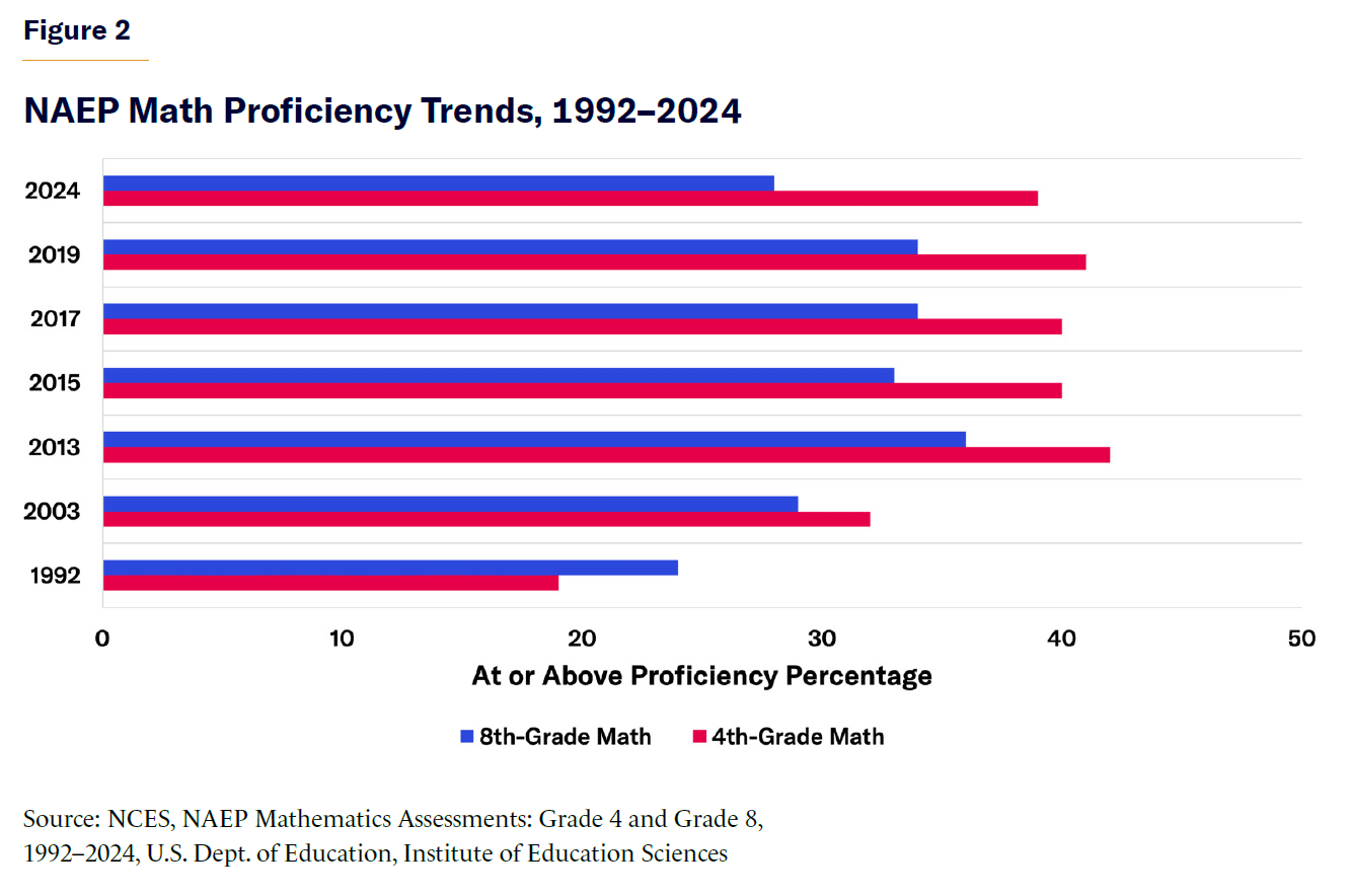 Math proficiency followed a similar pattern (Figure 2). In 1992, only 19% of fourth-graders and 24% of eighth-graders were proficient. Scores improved steadily through the early 2000s, reaching 32% (fourth grade) and 29% (eighth grade) by 2003. As with literacy, the peak occurred in 2013, with 42% of fourth-graders and 36% of eighth-graders proficient. However, after 2015, scores declined again—fourth-grade math plateaued at 40%, while eighth-grade scores fell to 33%. In 2024, only 39% of fourth-graders and 28% of eighth-graders met proficiency standards.