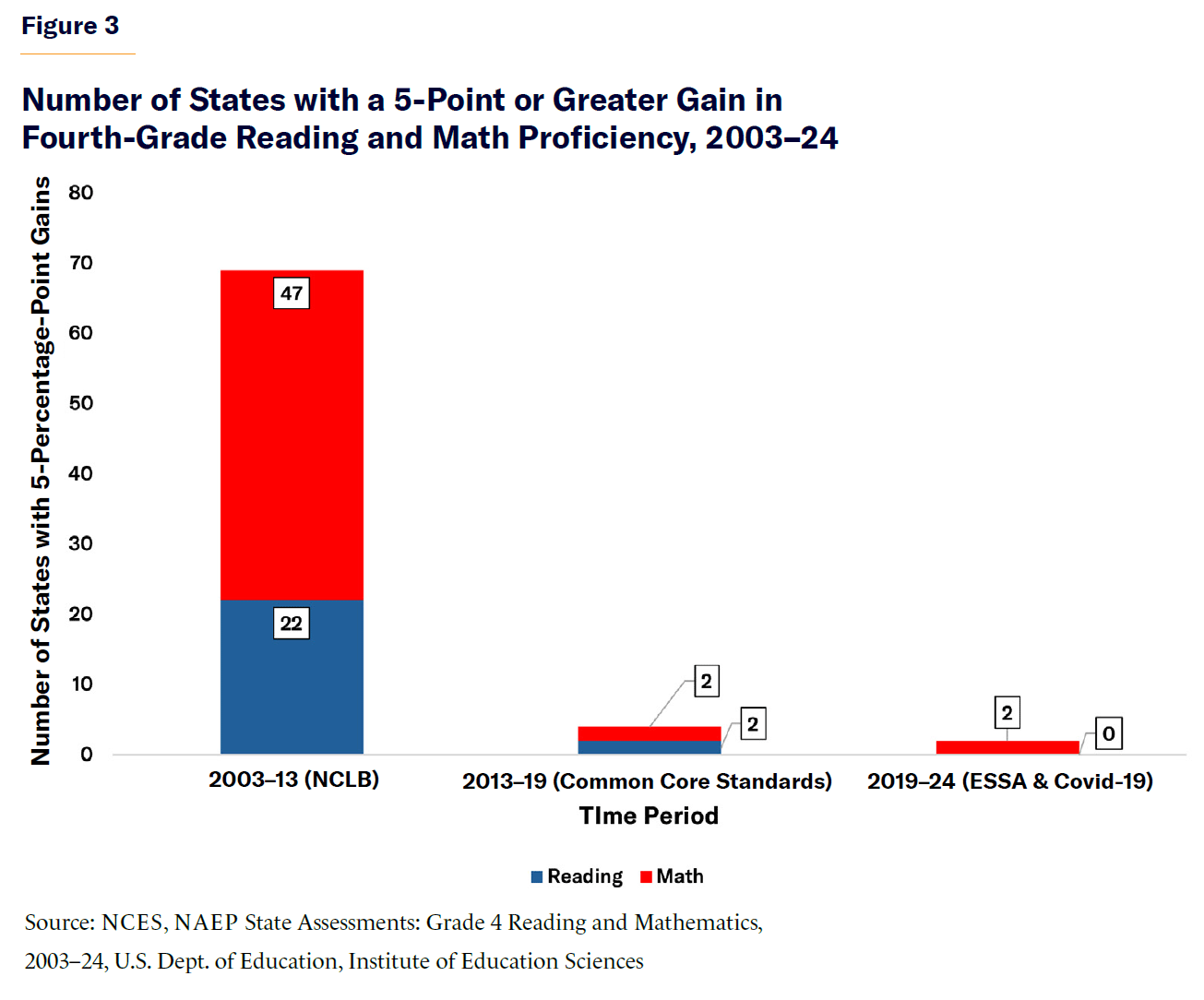 State-level data reveal where these declines are most severe and which states have resisted these downward trends. Apart from Massachusetts, no state had more than half its students reach proficiency in reading or math, highlighting the urgent need for systemic change in education. Between 2003 and 2013, student performance improved in many states, with 22 states seeing at least a 5-point gain in fourth-grade reading and 47 states seeing the same increase in fourth-grade math (Figure 3). Gains were also evident (Figure 4) in eighth-grade reading (18 states) and math (36 states). This period overlaps with the implementation of NCLB, which emphasized accountability, standardized assessments, and interventions for struggling schools.
