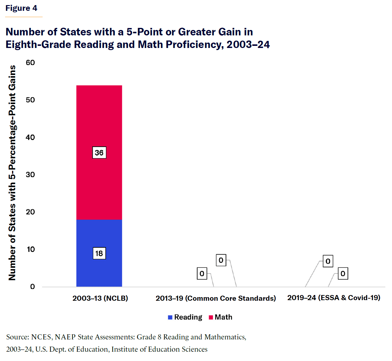 From 2019 to 2024, no state recorded a 5-percentage-point or more increase in reading proficiency; just two states (Alabama and Louisiana) saw these gains in fourth-grade math. For eighth-graders, not a single state achieved a 5-percentage-point gain in either subject. Shortly before this period, the Adequate Yearly Progress measurement, which focused on states moving toward student growth models rather than student proficiency benchmarks, was eliminated under ESSA.[6] Adequate Yearly Progress was the term for the amount of annual achievement growth expected to be accomplished by students in a particular school, district, or state under NCLB.[7] It was a useful diagnostic tool that determined how schools needed to improve and how schools should delegate limited resources to achieve those goals.