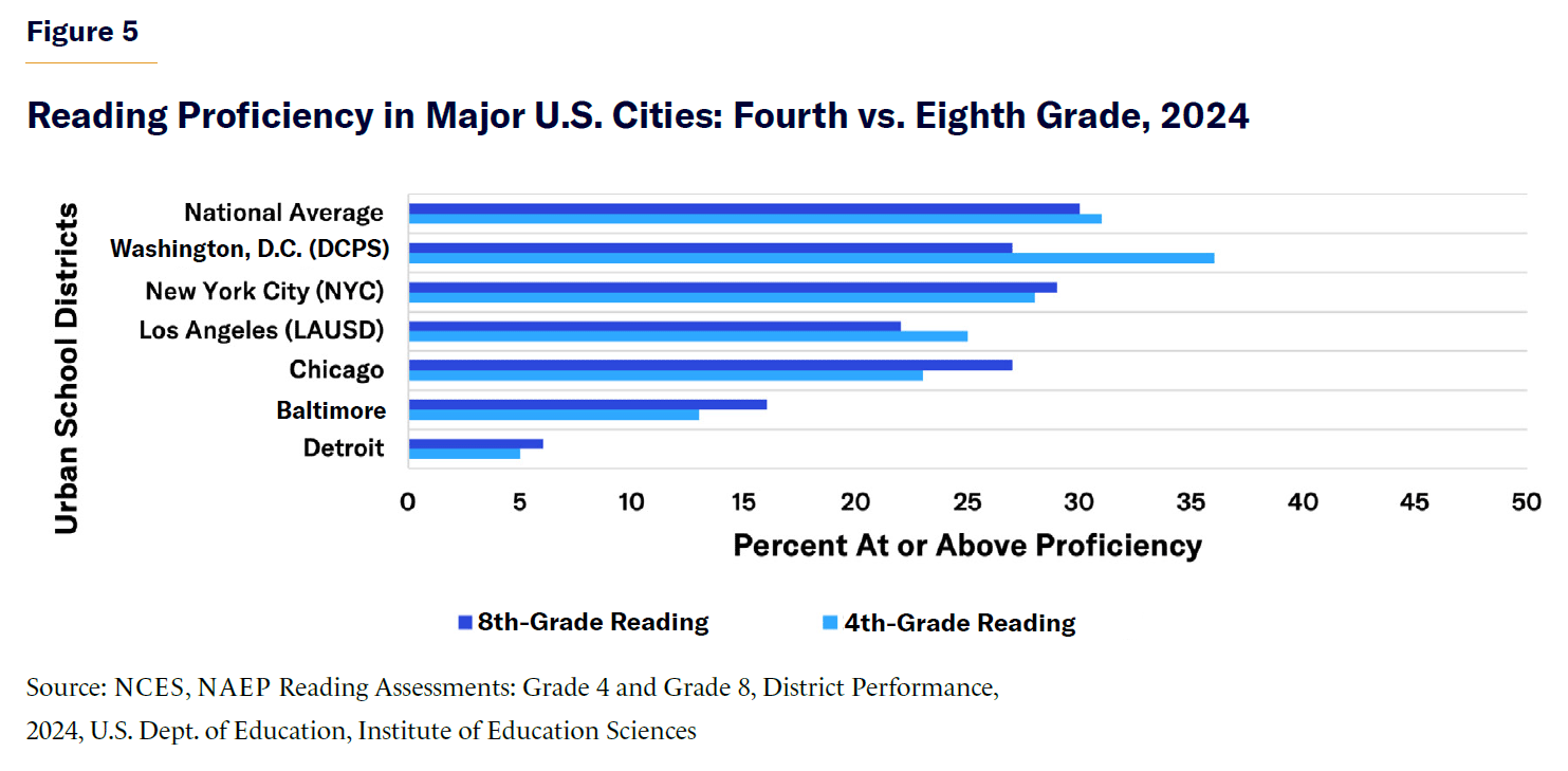 New York City (NYC), the nation’s largest urban district, continues to struggle with low proficiency rates in reading and math despite decades of reform efforts and the highest per-pupil spending in the country.[8] Only 28% of NYC’s fourth-graders are proficient in reading, compared with 31% nationally. In math, fourth-grade proficiency is 33%, behind the national average of 39%, while eighth-grade math proficiency is just 23%, well below the 28% national rate. NYC represents failures in effective accountability measures and evidence-based instructional models that could have improved student academic performance. NYC also reflects the broader systematic failures of bureaucratic governance in urban public schools.