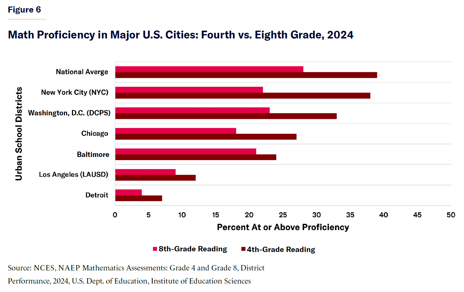 Urban school districts highlight disparities in student achievement. In cities like Washington, D.C., New York, Chicago, Los Angeles, and Houston, reading (Figure 5) and math (Figure 6) proficiency have remained below 30% for the past two decades. I will expand on two of these major metro centers here.